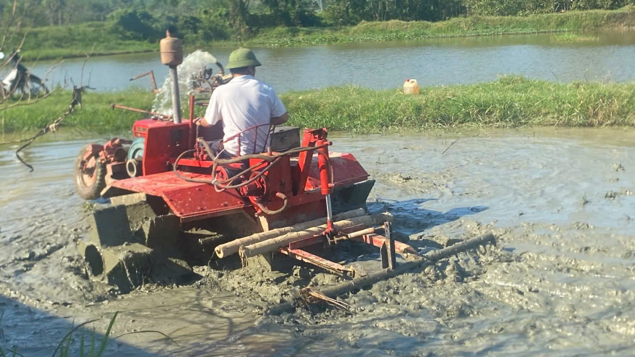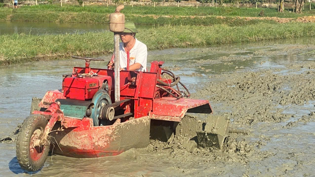 Máy bừa thuyền được đưa vào sản xuất, hỗ trợ nông dân làm đất, cấy lúa hiệu quả tại vùng chiêm trũng thôn Phú Sơn, xã Mậu Lâm.