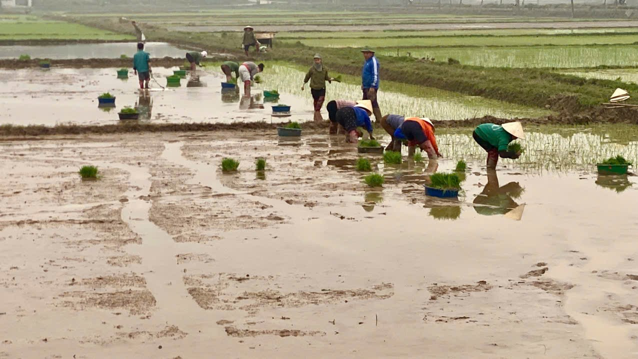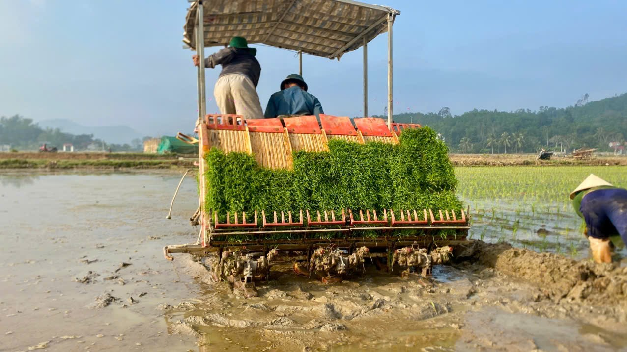 Bên cạnh phương pháp cấy thủ công truyền thống, tại một số cánh đồng, nông dân đã mạnh dạn áp dụng cấy lúa bằng máy, sử dụng mạ khay được chuẩn bị sẵn. Cấy máy giúp bảo đảm mật độ đồng đều, tiết kiệm công lao động, rút ngắn thời gian cấy, đáp ứng yêu cầu sản xuất trong điều kiện thiếu lao động thời vụ. Việc kết hợp linh hoạt giữa cấy thủ công và cấy máy phù hợp với điều kiện ruộng đất và khả năng của từng hộ gia đình, góp phần đẩy nhanh tiến độ cấy lúa vụ đông xuân trên toàn xã.