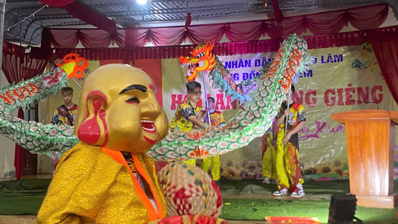 Không khí hội làng càng trở nên sôi động, rộn ràng với màn múa lân đặc sắc. Tiếng trống lân dồn dập vang lên giữa sân làng như đánh thức nhịp sống mùa xuân, hòa cùng những tràng pháo tay, tiếng reo vui của Nhân dân. Những bước nhảy uyển chuyển, mạnh mẽ của đội lân không chỉ tạo nên bầu không khí tưng bừng mà còn gửi gắm ước vọng về một năm mới an khang, thịnh vượng, phát tài phát lộc.