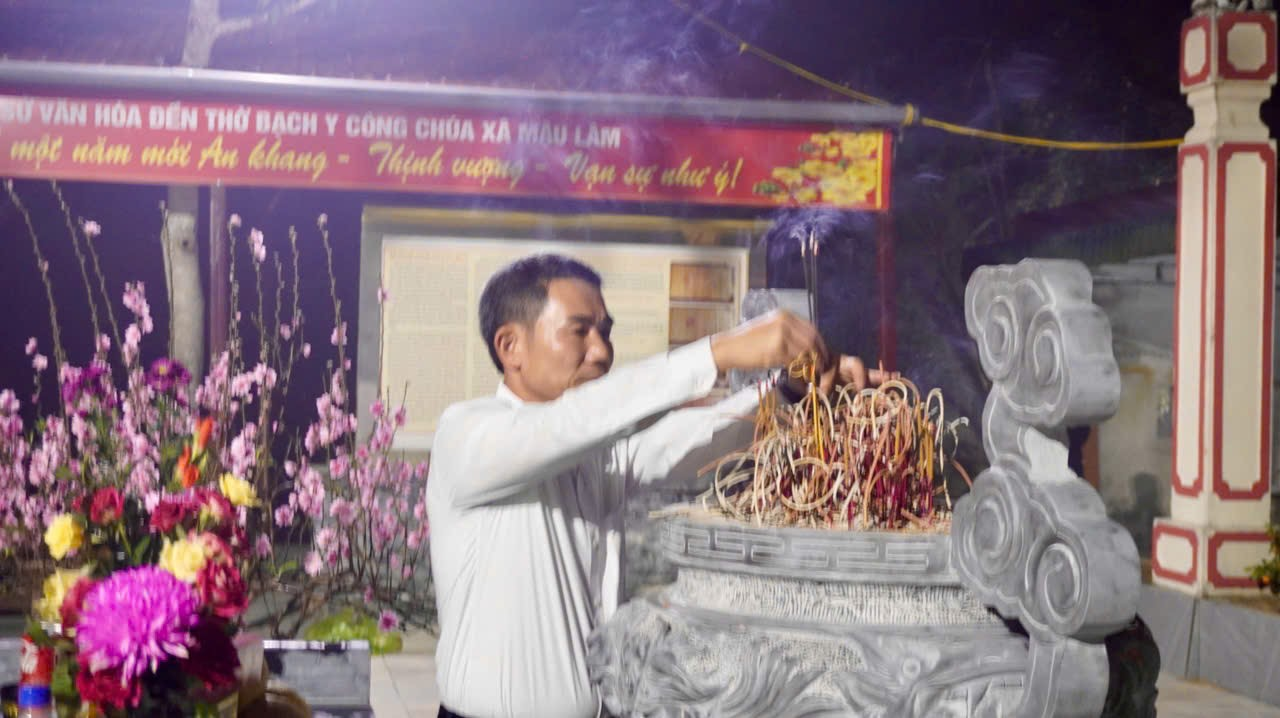 Đồng chí Hoàng Văn Thủy, Phó Bí thư Đảng ủy, Chủ tịch UBND xã Mậu Lâm thành kính dâng hương tại Đền thờ Bạch Y Công Chúa ngay sau thời khắc giao thừa Xuân Bính Ngọ 2026.