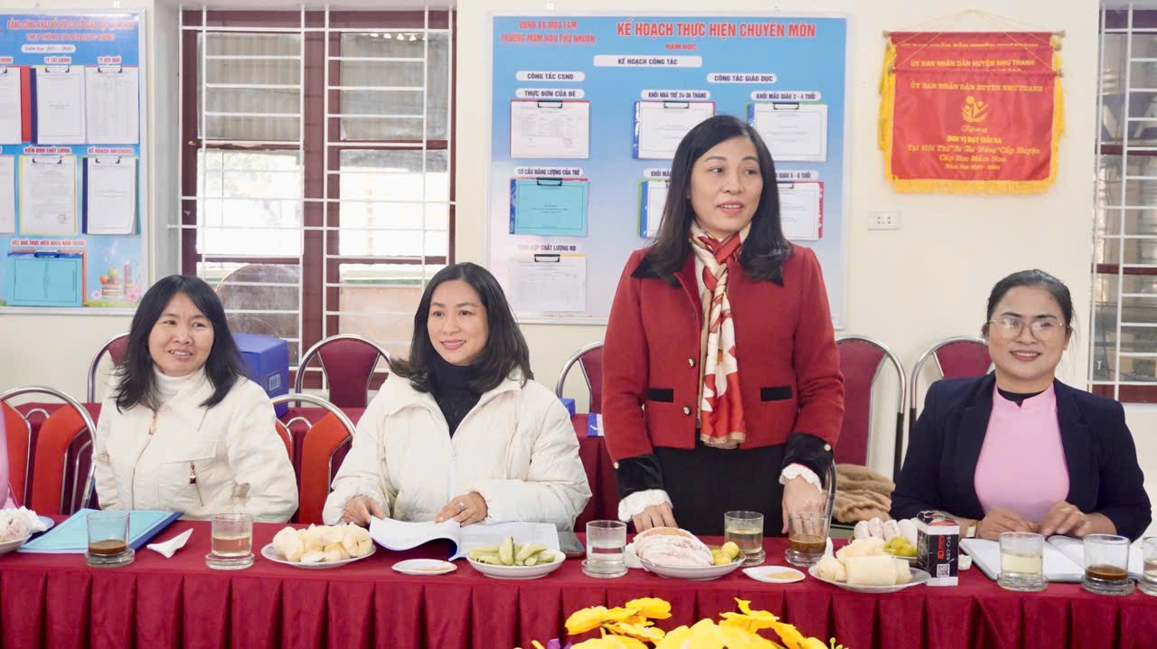 Đồng chí Nguyễn Thị Hiền – Bí thư Chi bộ, Hiệu trưởng Trường Mầm non Phú Nhuận làm việc với đoàn Phòng Giáo dục Mầm non (Sở GD&ĐT) tại Trường Mầm non Phú Nhuận, xã Mậu Lâm.( Ảnh đầu bên phải )
