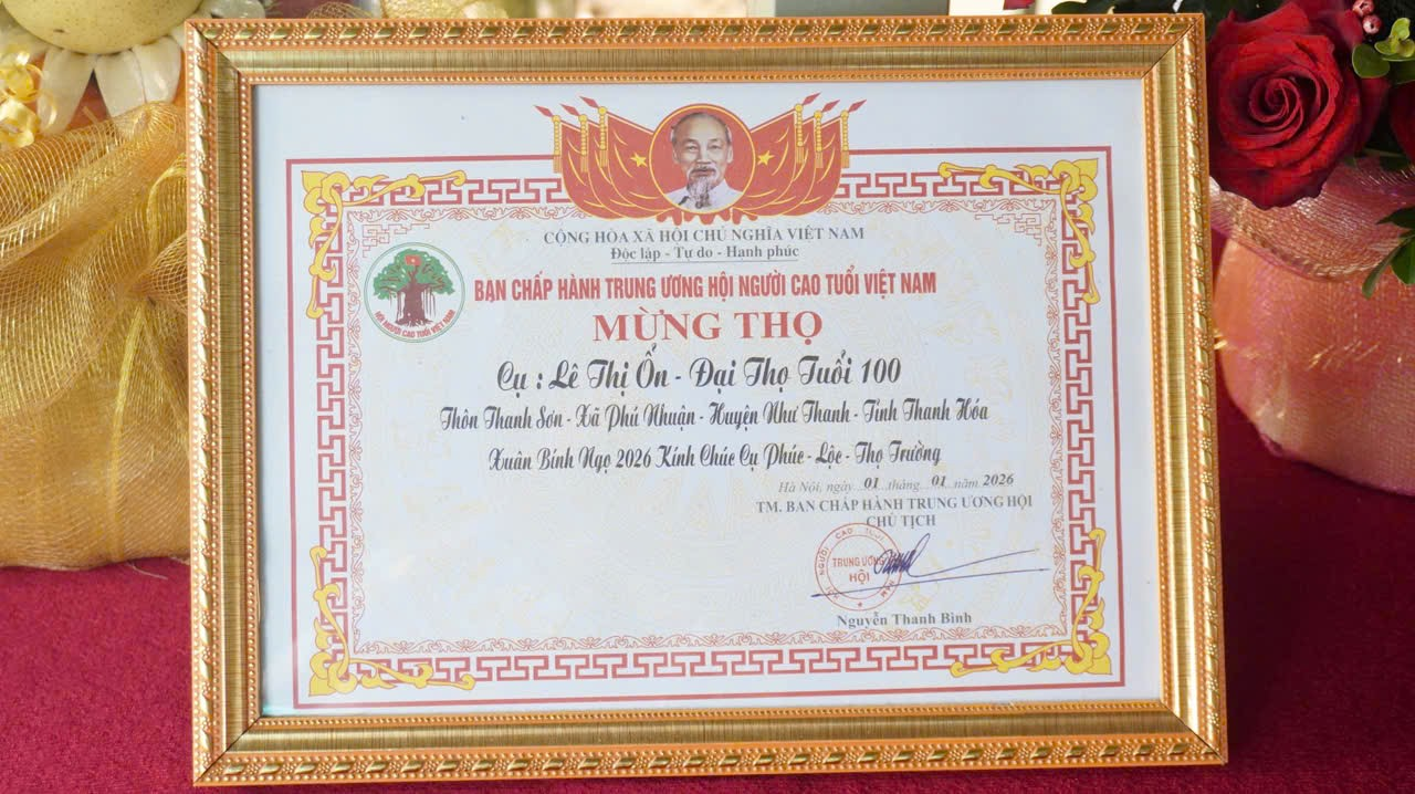 Nhân dịp này, đồng chí Lê Văn Cường đã thay mặt cấp ủy, chính quyền địa phương trao Giấy mừng thọ của Ban Chấp hành Trung ương Hội Người cao tuổi Việt Nam chúc thọ cụ Lê Thị Ổn, tròn 100 tuổi, trú tại thôn Thanh Sơn, xã Phú Nhuận (nay thuộc xã Mậu Lâm). Đây là sự ghi nhận, thể hiện sự quan tâm của Đảng, Nhà nước và các cấp Hội Người cao tuổi đối với lớp người cao tuổi – những cây cao bóng cả của quê hương; đồng thời góp phần lan tỏa, phát huy truyền thống tốt đẹp “kính lão, trọng thọ” của dân tộc Việt Nam.