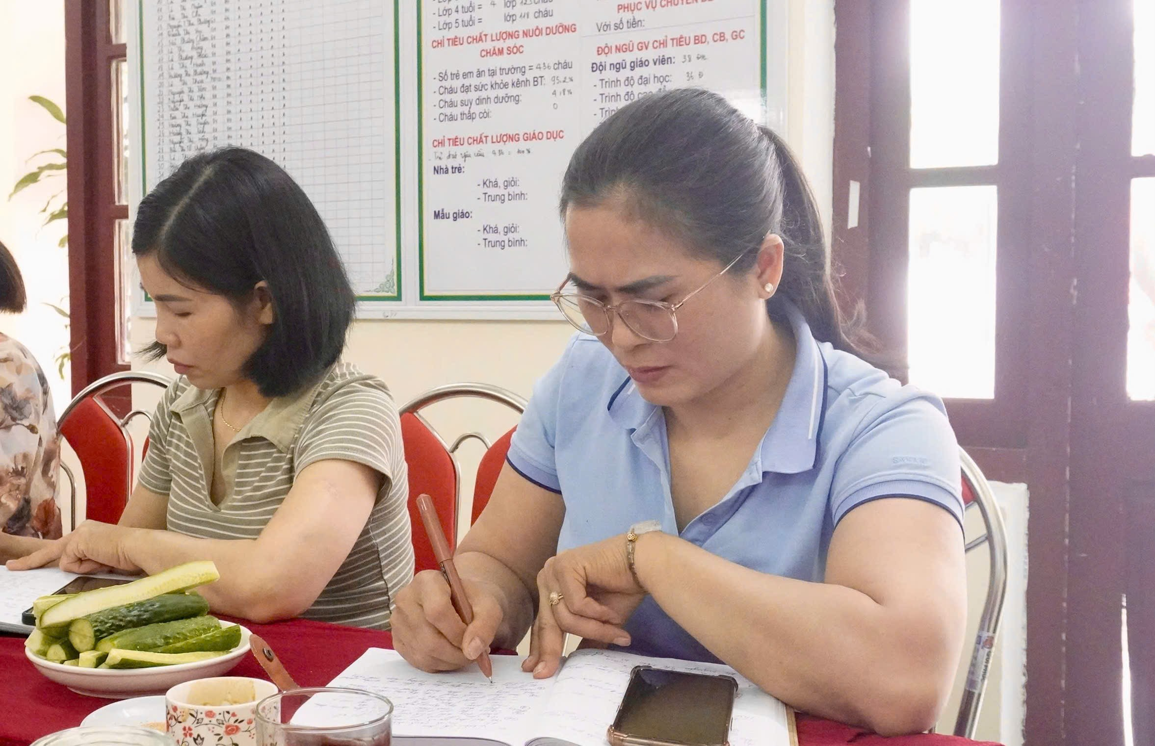 Sau dự giờ, cán bộ quản lý và giáo viên đã trao đổi, phân tích bài học, tập trung vào phương pháp tổ chức hoạt động, cách sử dụng đồ dùng dạy học và hiệu quả tương tác với trẻ. Các ý kiến thảo luận thẳng thắn, mang tính xây dựng, giúp giáo viên rút ra nhiều kinh nghiệm thiết thực trong quá trình giảng dạy.