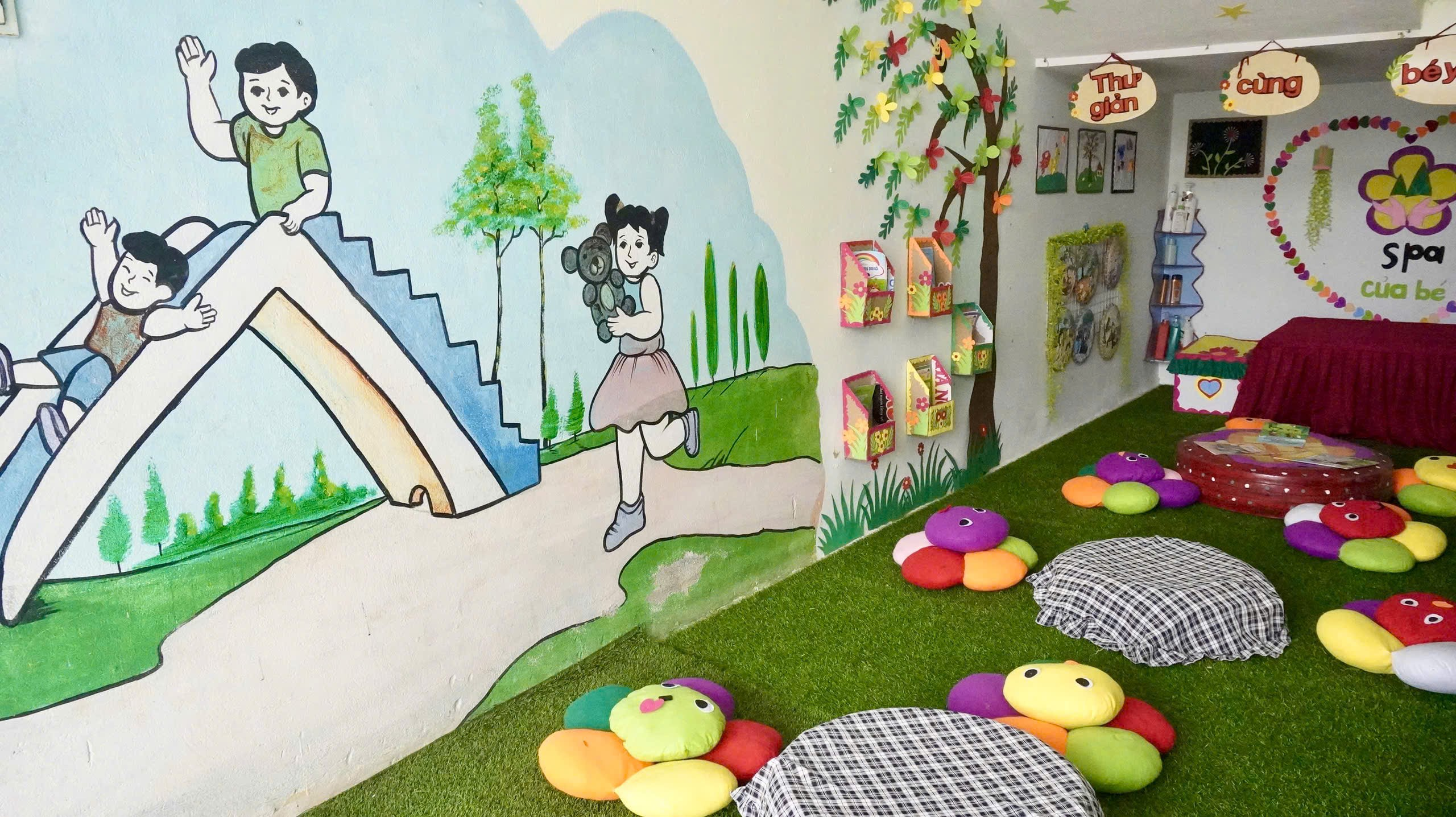 Toàn cảnh khu vui chơi và các phòng học được bố trí khoa học, tạo môi trường học tập thân thiện, an toàn cho trẻ.
