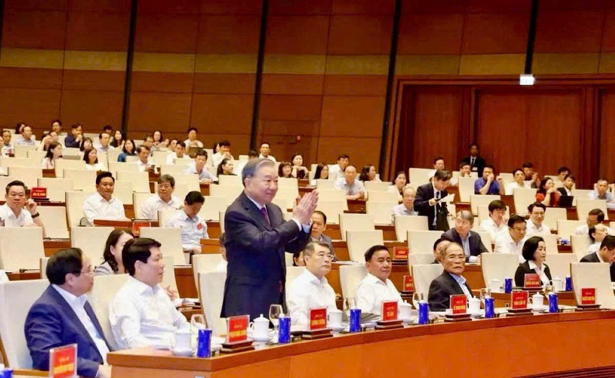 Tổng Bí thư, Chủ tịch nước Tô Lâm cùng các đồng chí lãnh đạo Đảng, Nhà nước và các đại biểu tham dự tại điểm cầu Hội trường Diên Hồng. ( Ảnh: TTXVN ).